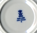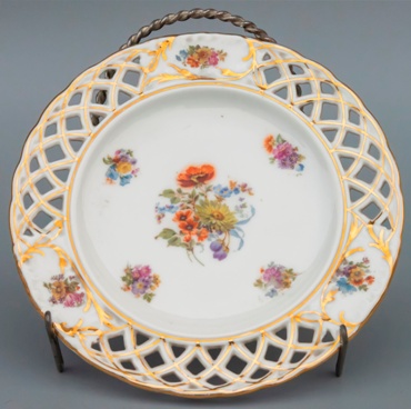 porcelán, prořezávaný okraj, jemný barevný květinový dekor na bílé bázi a zlacení. Vespod modrá tištěná značka štítu (úlu). Použita "vídeňská" značka.