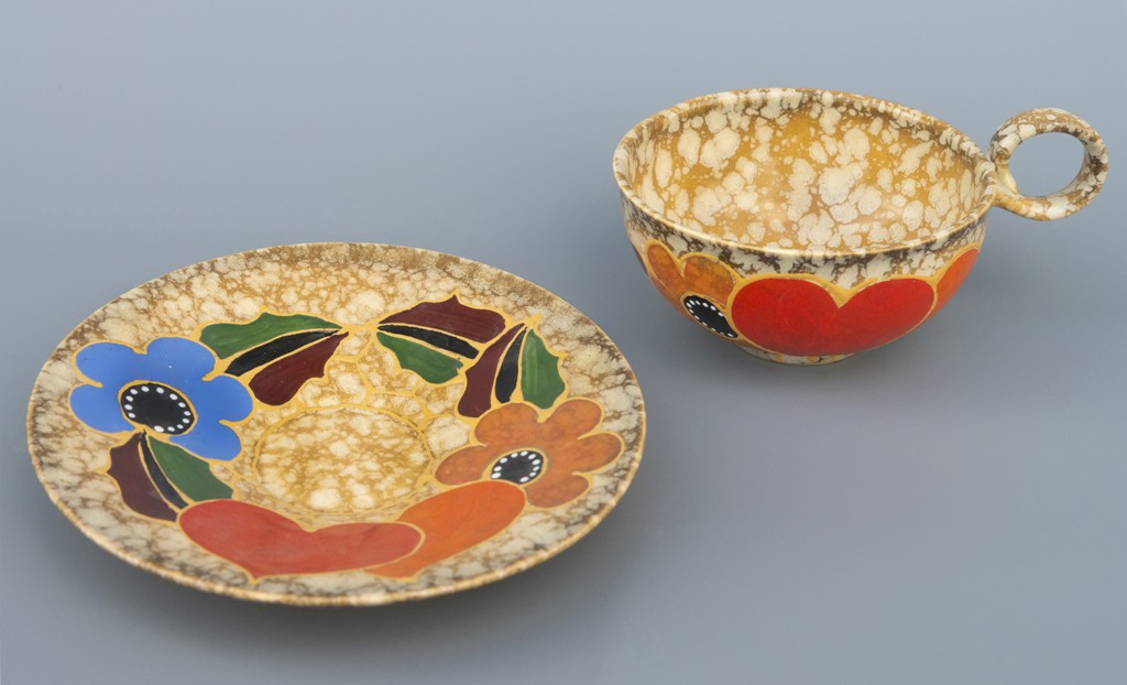 keramika glazovaná, DITMAR-URBACH, kulovité úchopy a vysoko posazená kruhová ouška. Dekor s výraznými srdci a květy na mramorovaném podkladě. Značeno vtlačeným číslem 1281, typ MADELON, kolem roku 1930, ART DECO.