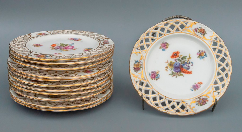 porcelán v barvě slonové kosti. Razítko "Stará Role, Ruční práce, Fr. Repík Č.S.R." a tištěná značka GB Made in Czechoslovakia, značka porcelánky po roce 1945. Dekor zlaté linky a stylizovaný monogram DK. Na jednom talíři drobný oklep na hraně.