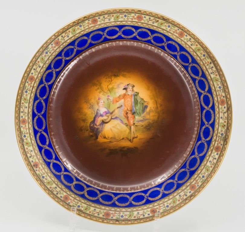 porcelán glazovaný, tištěně VLAJKA FSC Carlsbad Fine Porcelain Made in Czecho-Slovakia a tištěný ÚL/ŠTÍT - nepravá VÍDEŇ. Dekor galantní scény na hnědém podkladu, bordura s kobaltovou modří a ornamentem. 20. léta 20. století. Vespod od kraje ke středu prasklina cca 5 cm.