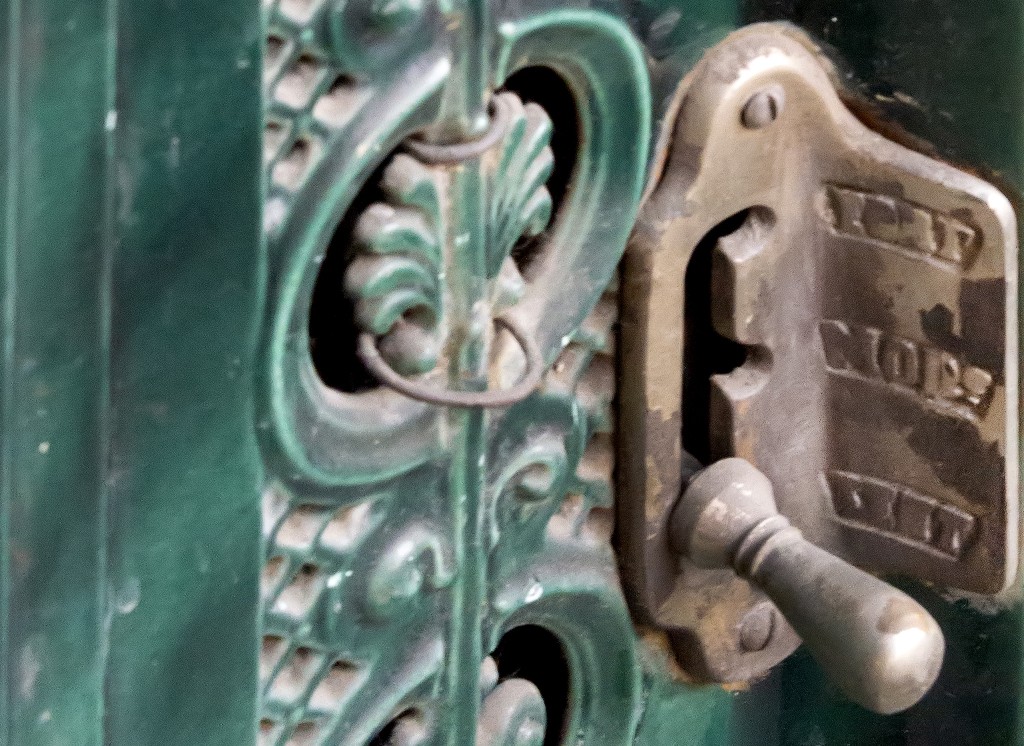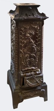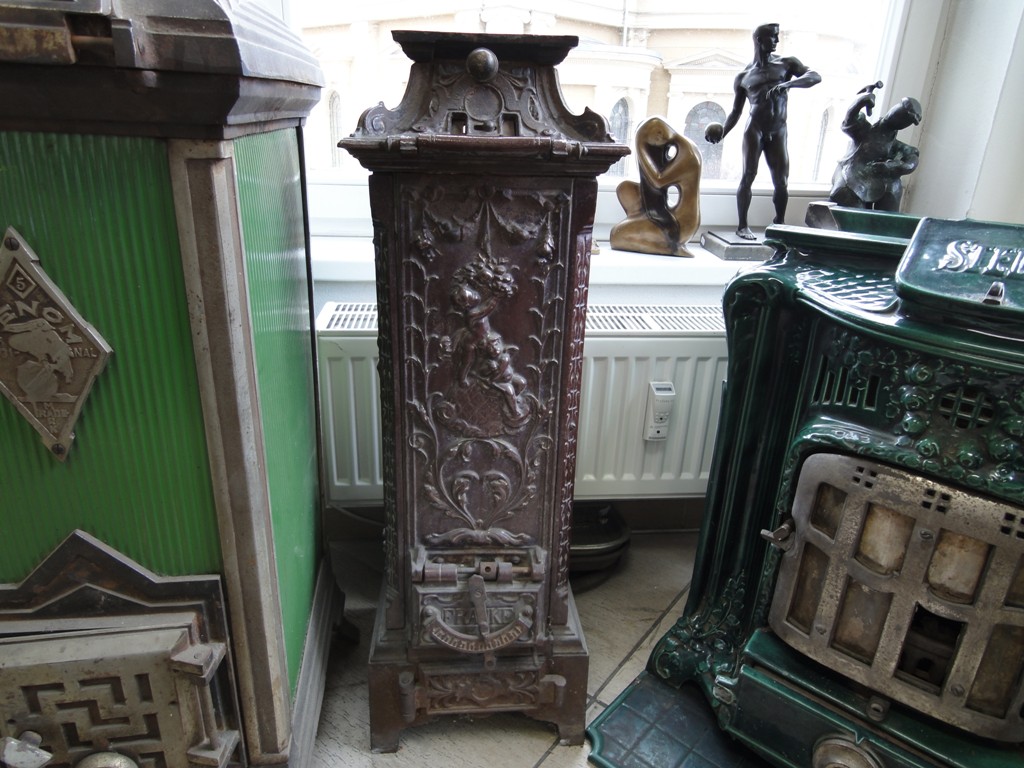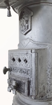 přes velká přední železná dvířka s osmi okénky vyplněnými slídou