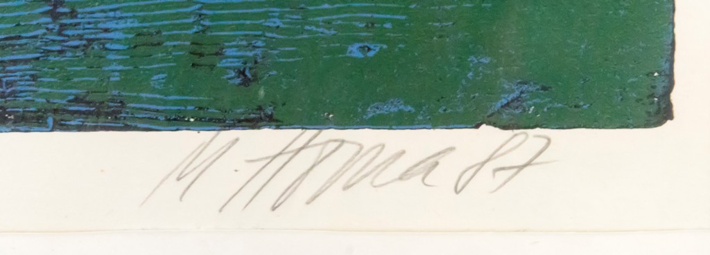 barevný dřevořez, signováno tužkou vpravo dole M. HOURA, datováno 1987, číslováno 4/12. Rám, pasparta, sklo